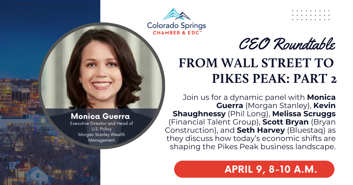 Following the success of our previous discussion, From Wall Street to Pikes Peak Part 2 continues the conversation on how national and global economic trends are shaping the business climate right here in Southern Colorado. Monica Guerra, Head of U.S. Policy at Morgan Stanley, will once again provide insights into the national and global economic outlook. Following her remarks, a panel of regional industry leaders will share how current economic conditions are impacting their organizations and industries. Join us for a candid and insightful conversation connecting Wall Street analysis with the on-the-ground experiences of Colorado Springs business leaders.Learn from our panelists:Kevin Shaughnessy, Phil LongMelissa Scruggs, Financial Talent GroupScott Bryan, Bryan ConstructionSeth Harvey, BlueStaq